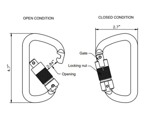 Triple locking steel Carabiner with Captive eye . ANSI Z359.12 -2009 K CSA Z259.12-16 9000lbs(40KN) Mbl Gate strength 3600lbs (16Kn) Can be used with or without captive eye pin