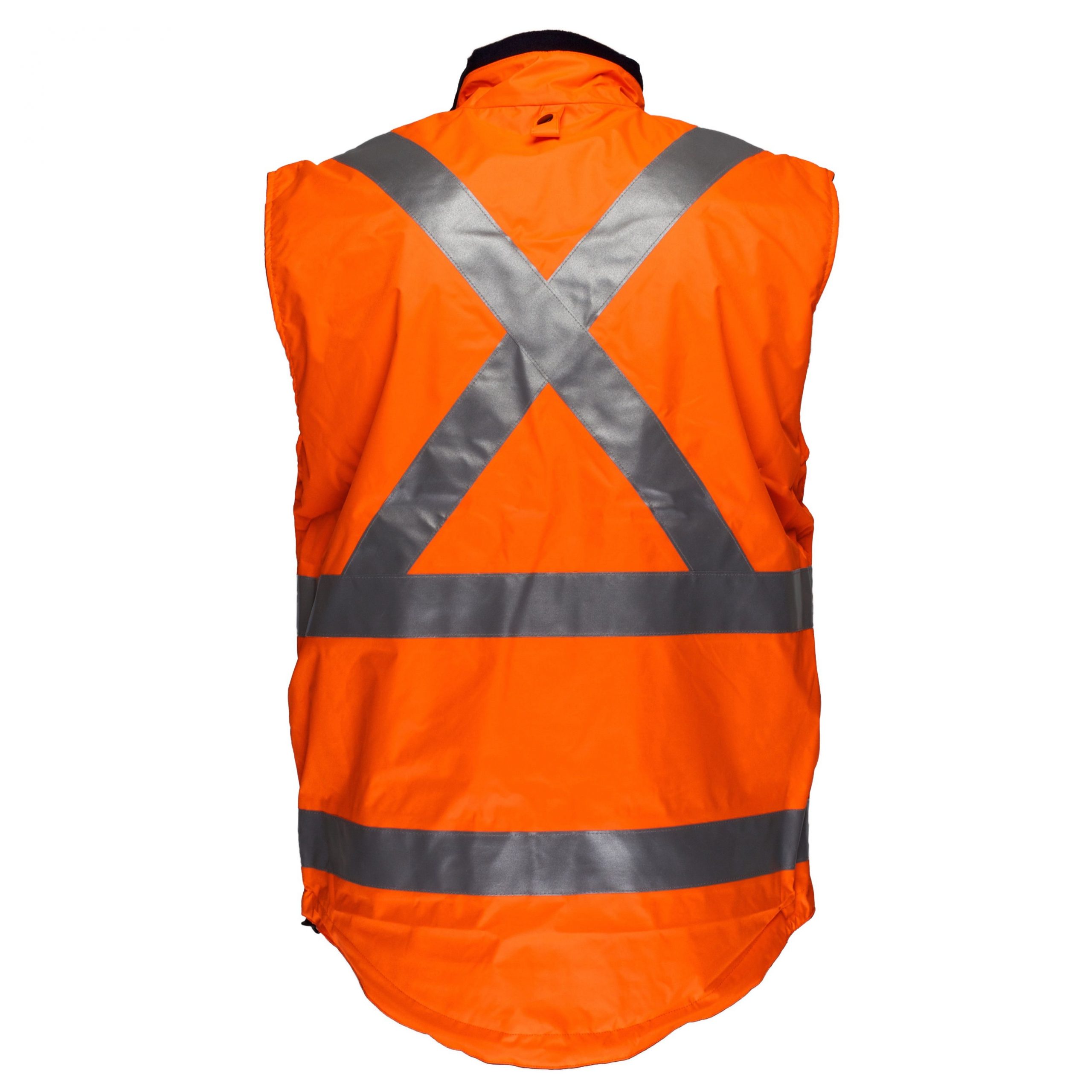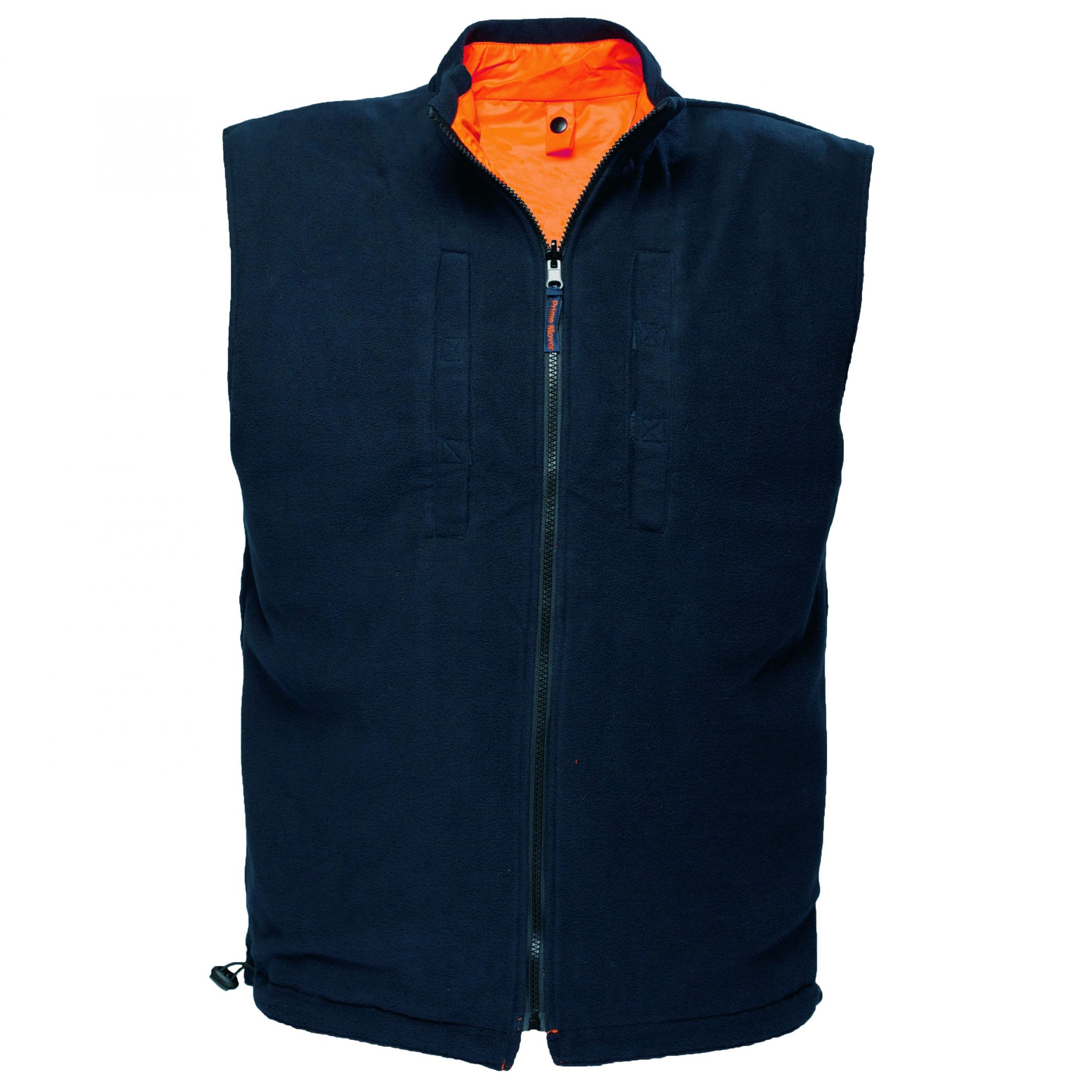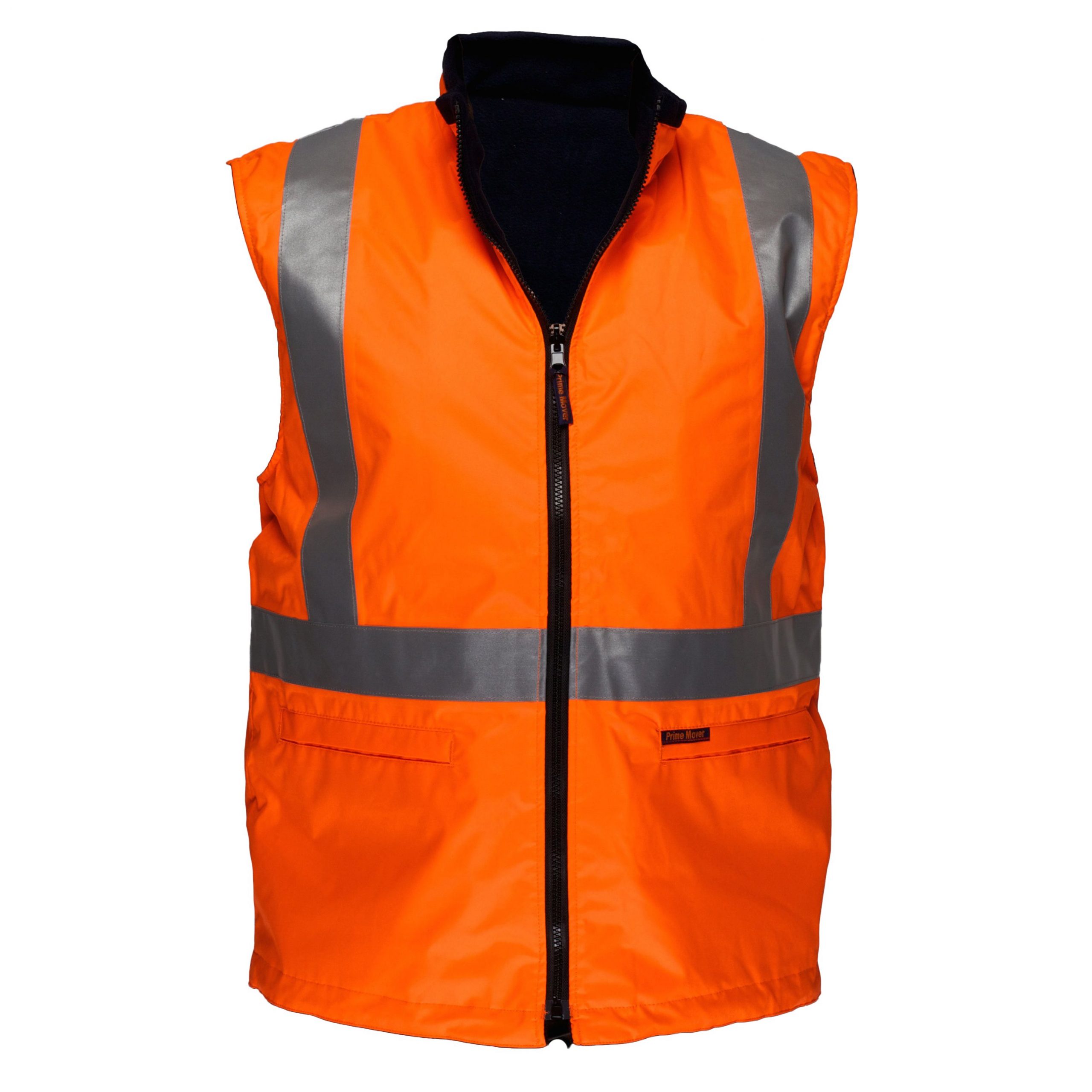 Hi-Vis Polar Fleece fully reversible vest with Heat seam sealed oxford waterproof shell. Tough plastic zipper closure and tough fastener Closures on embroidery pockets. Reflective tape in cross back configuration including tape on the tail (not on navy side). Makes a 4-in-1 set when zipped into MX306.