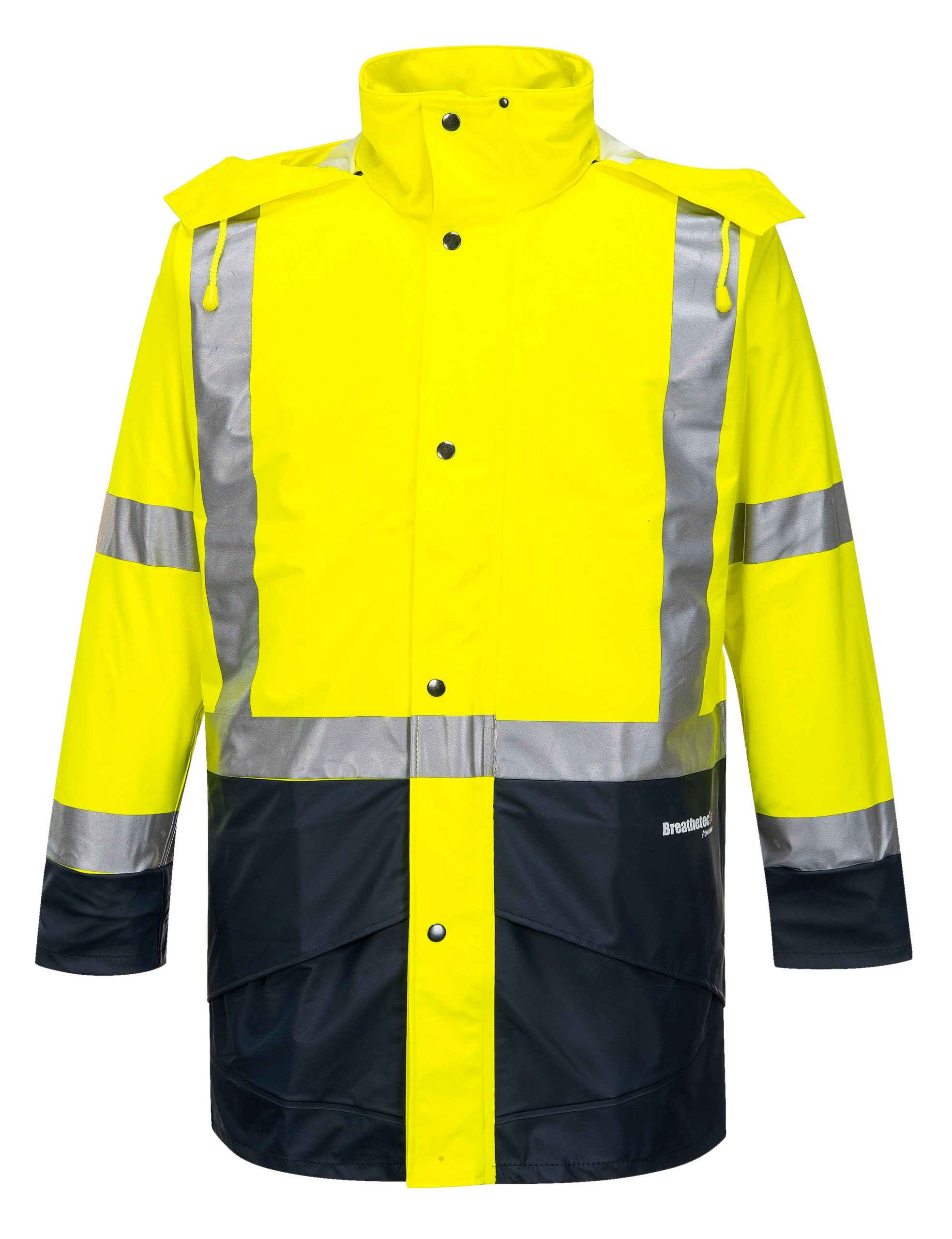 High visibility long line waterproof/breathable BREATHETEC PU jacket with durable knit backing, welded premium reflective tape detail, 4 way stretch, welded seams, large front pockets, adjustable stowaway hood & storm protection collar.