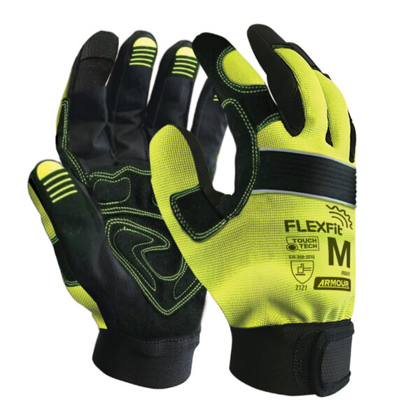 The Armour Flexi-Fit glove is made of a high-quality Synthetic Leather. A Hi Vis fabric on the back of the hand for great visibility and padded palm with an Anti-Vibration feature. The reinforced thumb crotch designed for extra durability, non-slip tips for firmer grip and a stretchable knuckle for better comfort provides all the features needed to fulfil your intended job requirements.
