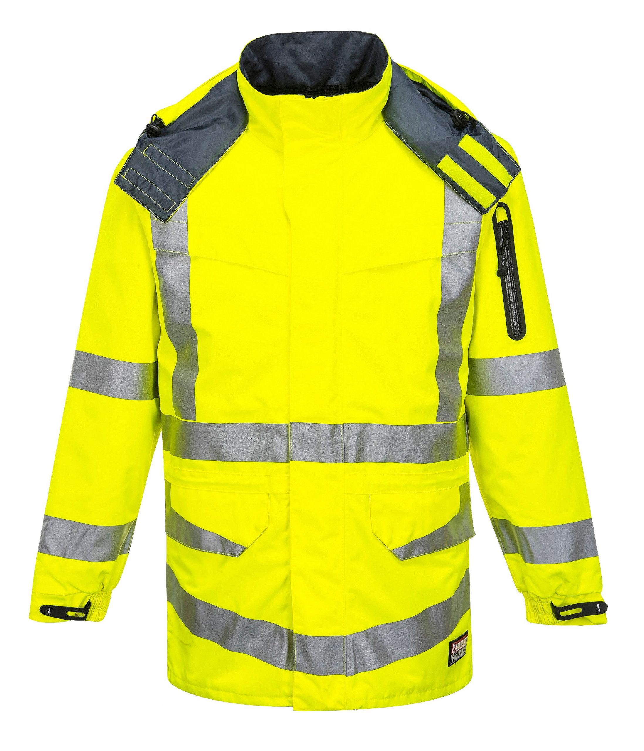 New “Soft Touch” but highly durable high visibility jacket, fully lined, waterproof/breathable with BREATHETEC™ coating on fabric. Also features premium heat sealed reflective tape, concealed fold-away hood, adjustable cuff and hems and multiple pockets.