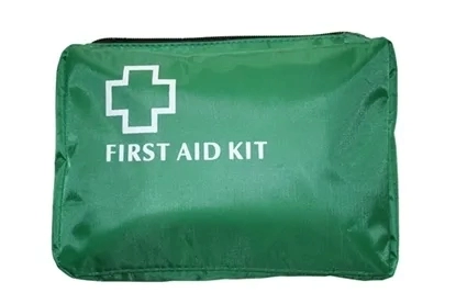 Green First Aid Bag No Handles 2 fold-out compartments.