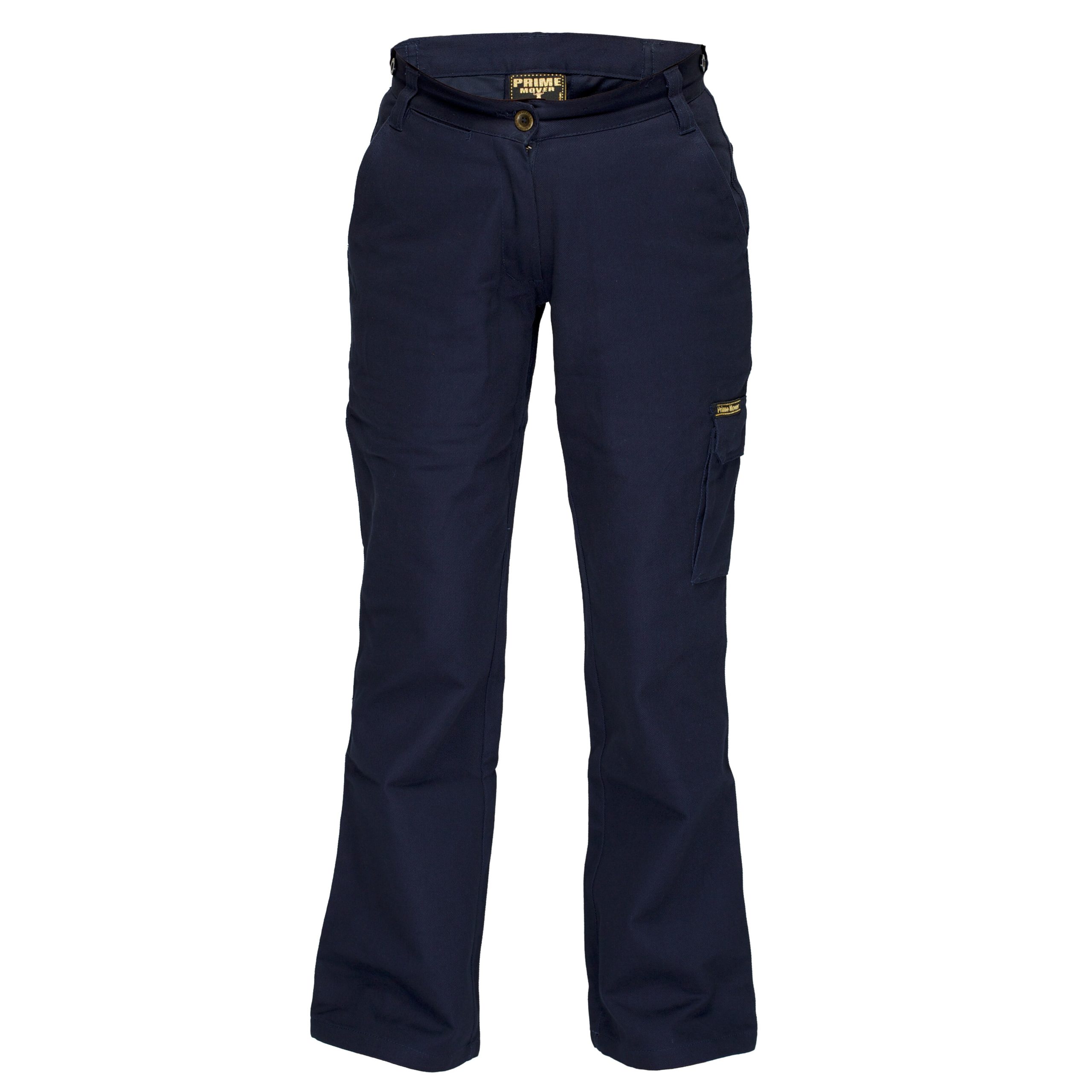 Ladies 100% Cotton Preshrunk cargo pants. Reinforced stress points and cargo pockets for extra style and storage. Includes ruler pocket and waist dart for better fit and tapered legs.