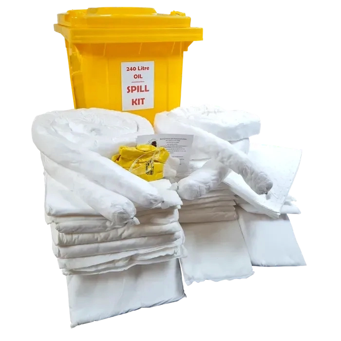 240 LITRES Contents___ Absorbent Pads 40 x 50cm Heavy Duty x 50__ Absorbent Sock 2.4m x 4__ Absorbent Pillow 25cm x 40cm x10__ Absorbent Pillow 40x50cmx 9__ Safety Glasses x 1__ Disposal Bag x 2__ Disposable Apron x 2__ Dust Mask x 1__ Safety Gloves x 1__ Basic Spill Handling Tips x 1__ 240 Ltr Wheelie Bin x 1__