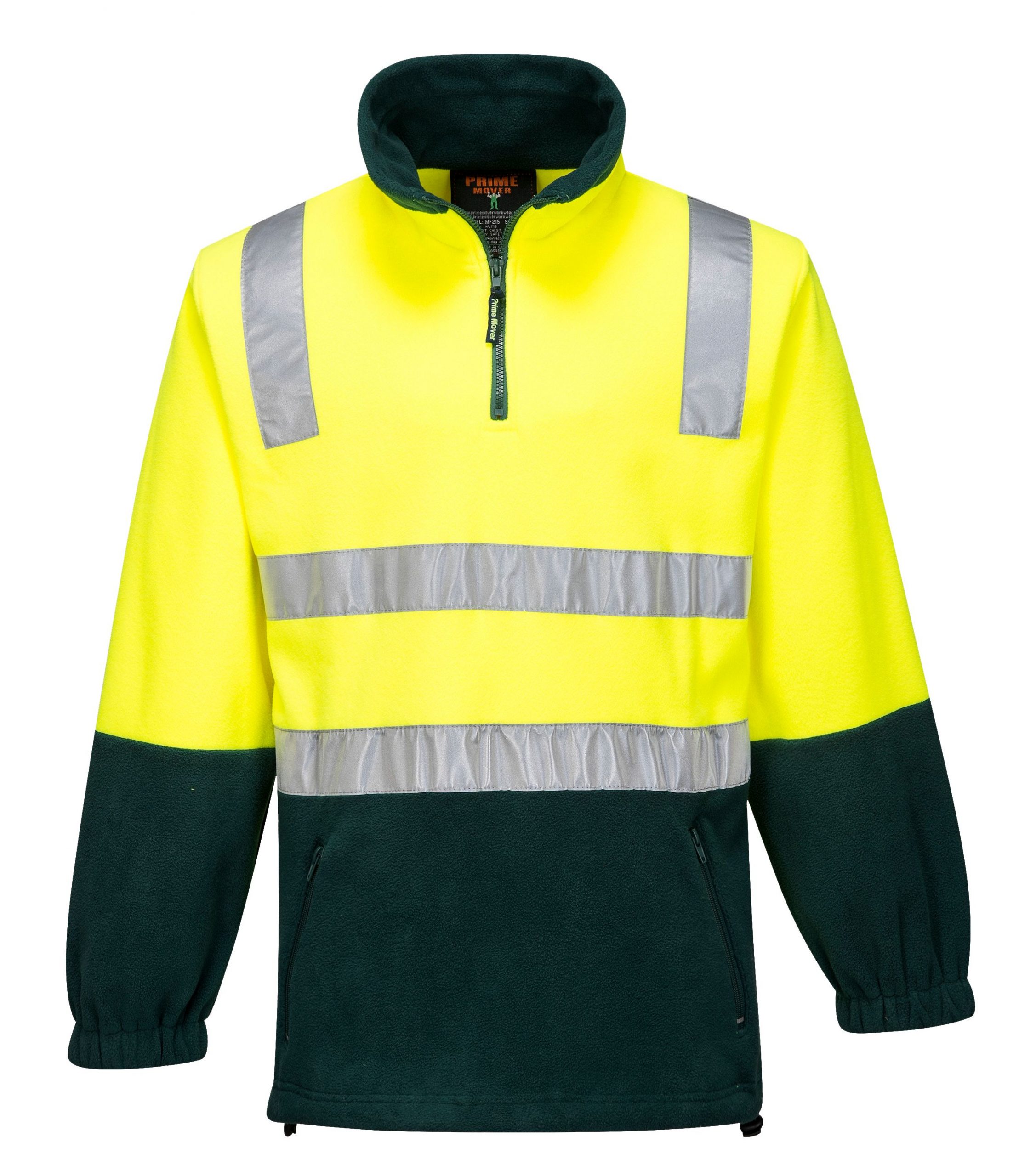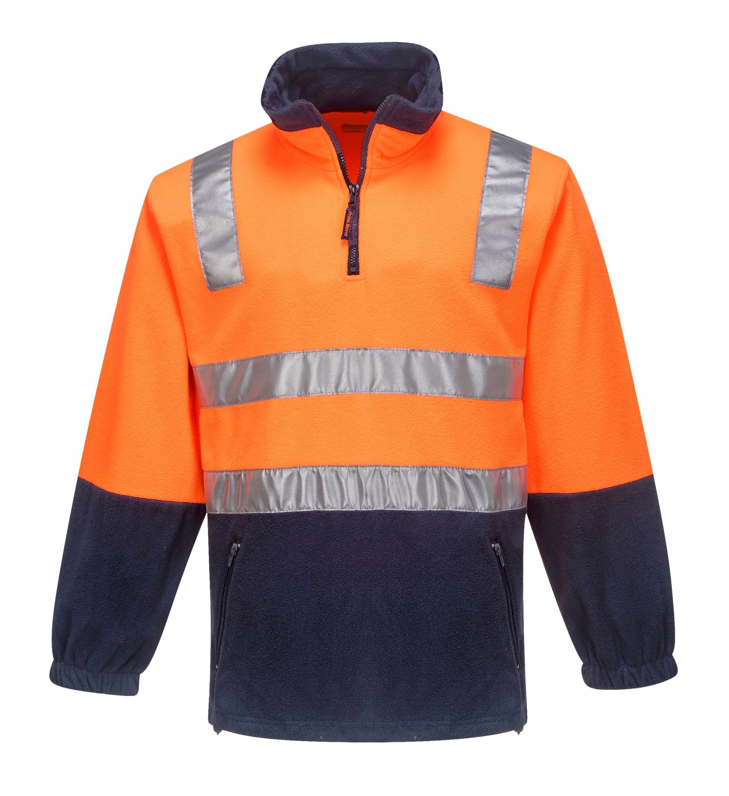 Hi-Vis Polar Fleece Jumper. Static Resistant, Anti Pill, Waist draw string and plastic zipper. Two zippered waist pockets. HiVistex reflective tape around body and over shoulders.